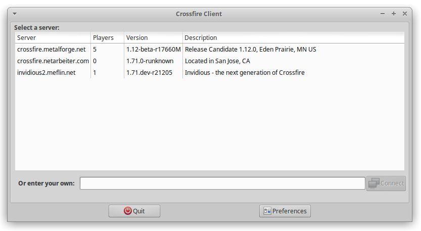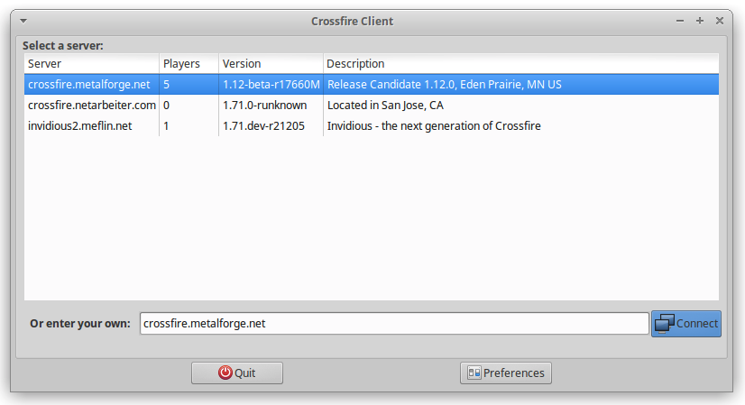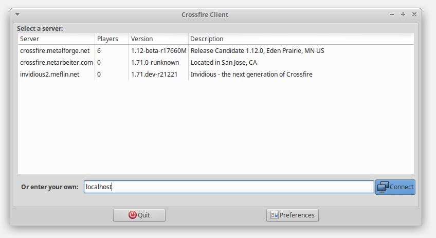 Or, you can also enter in a server name or ip address in the Or enter your own field for a server that is not in the metaserver list (such as localhost)