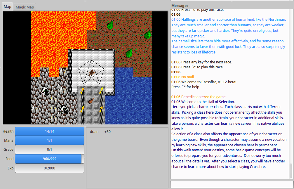 9. You are now in the race select process. you can scroll through the options as many times as you like. The client will display game lore about the race as you cycle (press any key to advance, press 'd' key to play the currently active/displayed race) through the options.