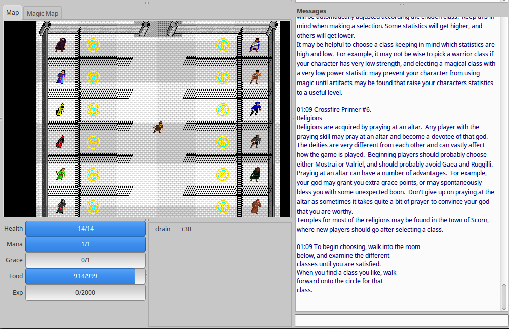 11. You will enter the class selection area. In the first step in each fenced hallway you get a description and summary of the class. Step on the yellow disk to make the final selection of that particular character class.