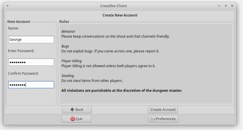 - Name: This is your account name; this is NOT what people will see you as within the game. This is used to keep your account secure and a way to manage your player character profiles.