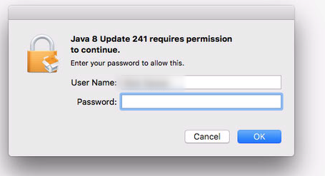 4. If prompted for login permissions to install Java, enter your password and click on the OK button