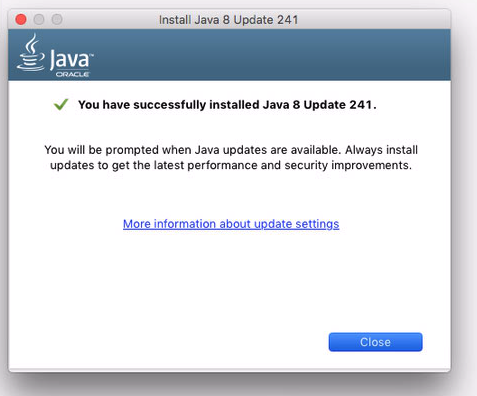 7. You should now see a “successfully installed” window for Java, click the Close button