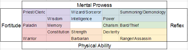 | Intelligence | Ability to think creatively | No puzzle or spell is too complicated to master | Wizard/Sorceror |
