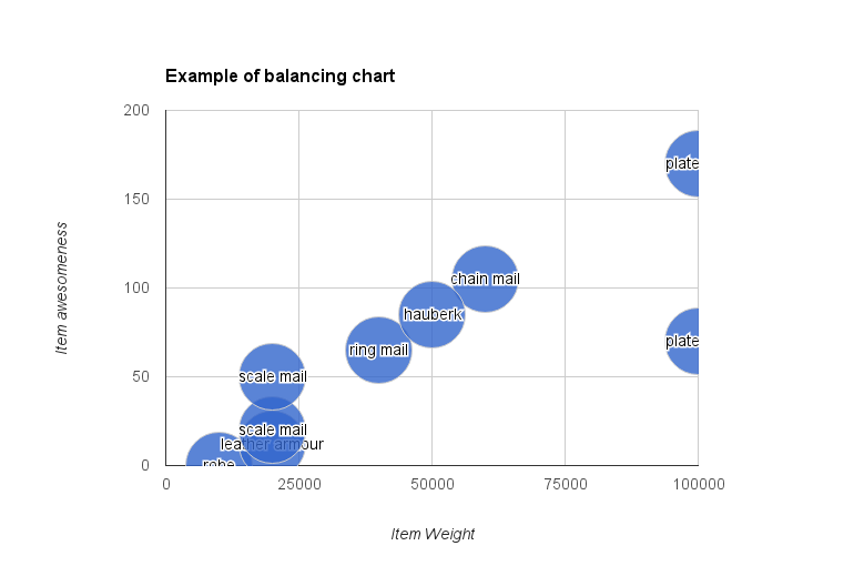 we can see that the items appear to progress fairly linearly with the exception of one of the types of platemail which is clearly a lot worse. This item is the bronze variant of platemail listed last on the above table. One approach might be to move it back into line, however, items will all start to feel the same.