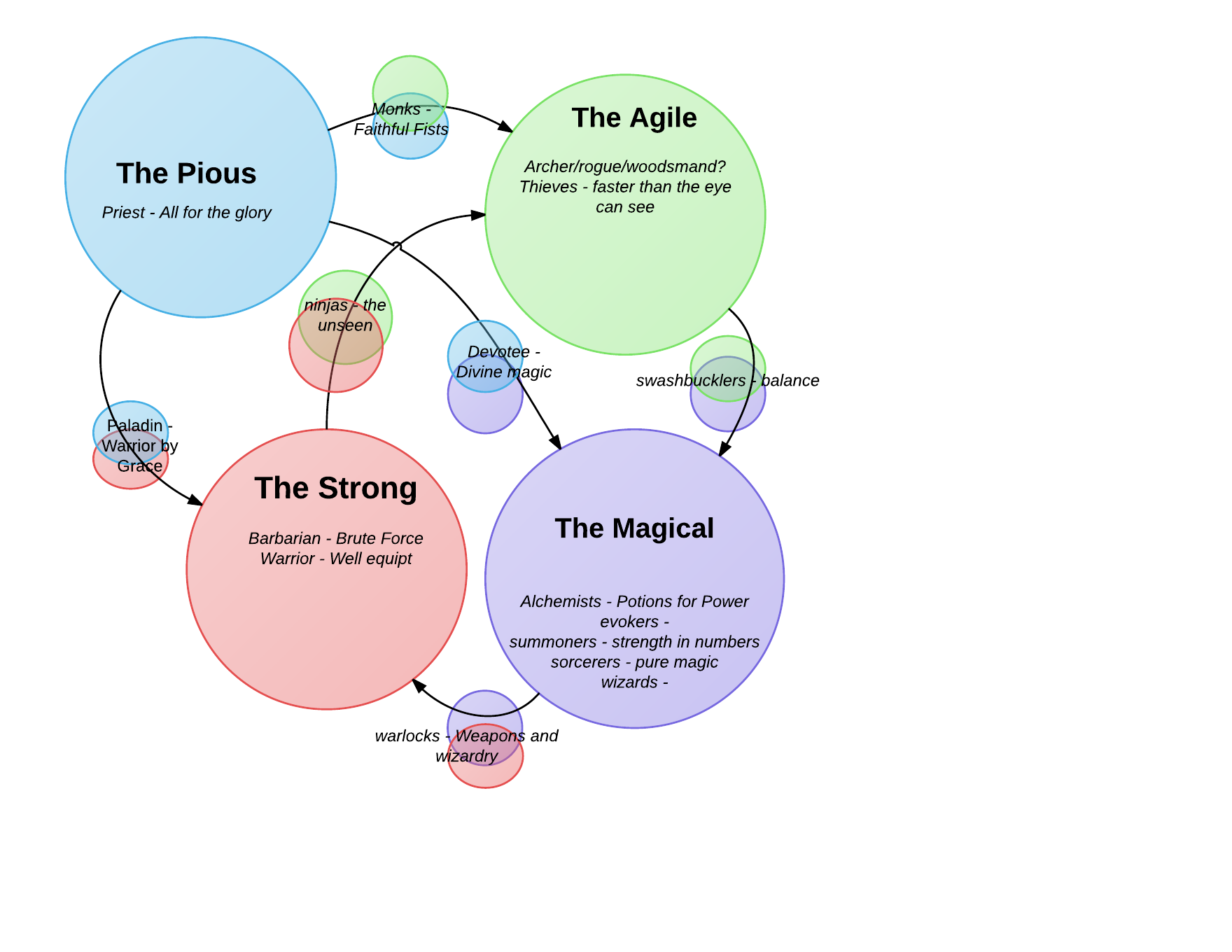 The current classes in crossfire end up resulting in the same character with the exception of monks due to little restriction in what a player can do after the early levels (skill objects and scrolls etc). I would like to add lasting variation differences between classes such as adding unique skills to each character that set it apart in a particular area of the game. The classes can be summarised based on the summary text included in the game available here. It could be argued that the most interesting characters are actually race selections and in particular the Dragon race provides a very unique experience for players. Having a similar approach to classes might add diversity and challenge to the characters selection and add interest in players choosing new characters after successfully leveling up and beating key maps with previous characters.These classes could be represented on a venn diagram like this: